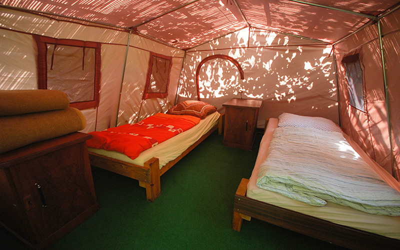 Beide dieser geräumigen Zelte (ca. 12qm) verfügen über zwei frisch bezogene Betten. Es gibt zwar keinen Stromanschluss, aber wir stellen tragbare Lampen zur Verfügung und bieten Zugang zu Steckdosen in allen öffentlichen Bereichen. Wie bei all unseren Unterkünften bieten wir kostenlose Handtücher und Zugang zu Schließfächern. Eine gute Wahl für diejenigen, die nach gemütlichem Komfort suchen, während sie im Freien schlafen. |