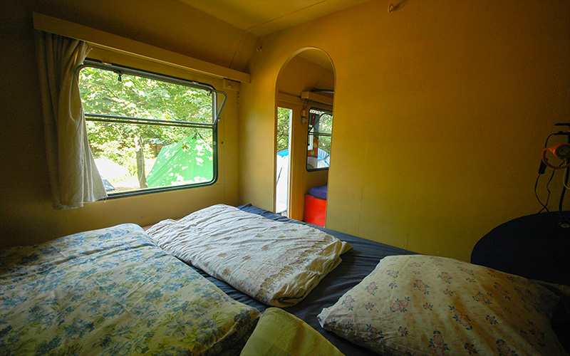 Der gemütliche Wohnwagen mitten im Garten ist 12 m² groß. Er beherbergt ein kuschliges Doppelbett für zwei Personen. |